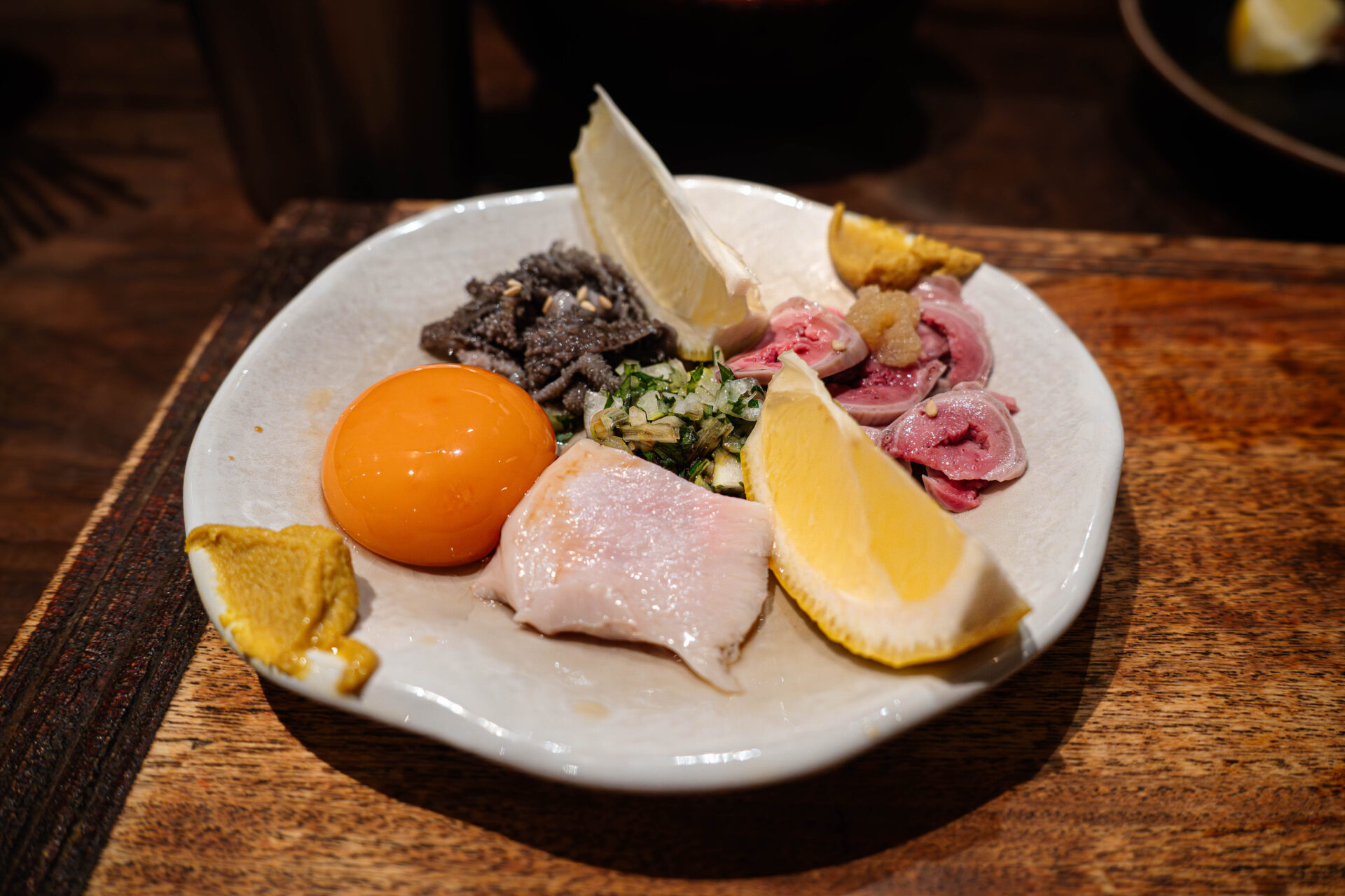 豚の胃袋とコブクロ、牛のセンマイが彩りよく並び、卵黄や薬味とともにいただきます。