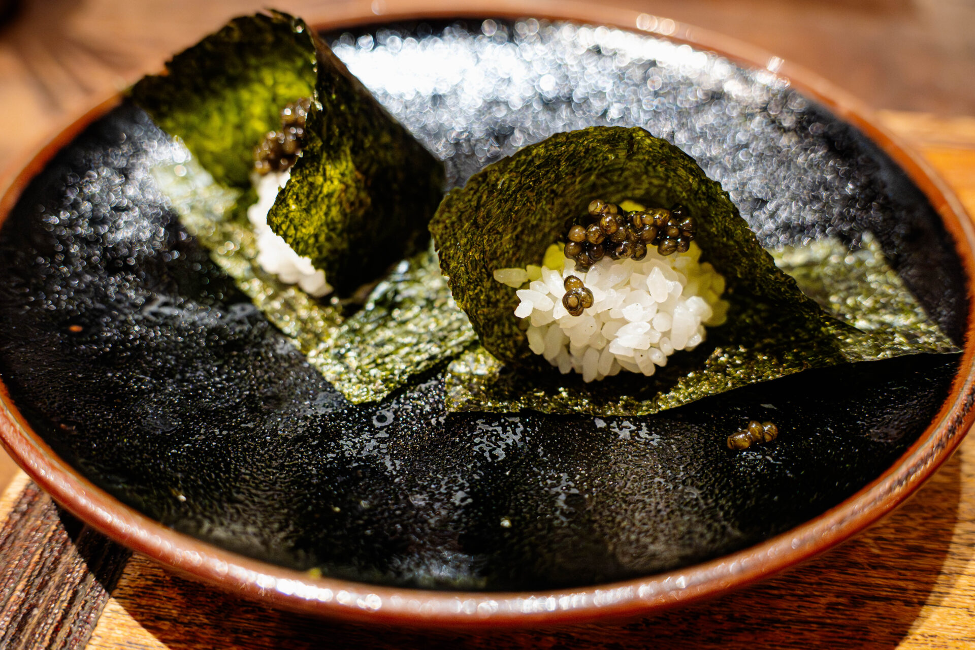 艶やかに炊き上げられた白米を香ばしい海苔で包み、その上にキャビアをのせた一口サイズのご飯ものです。